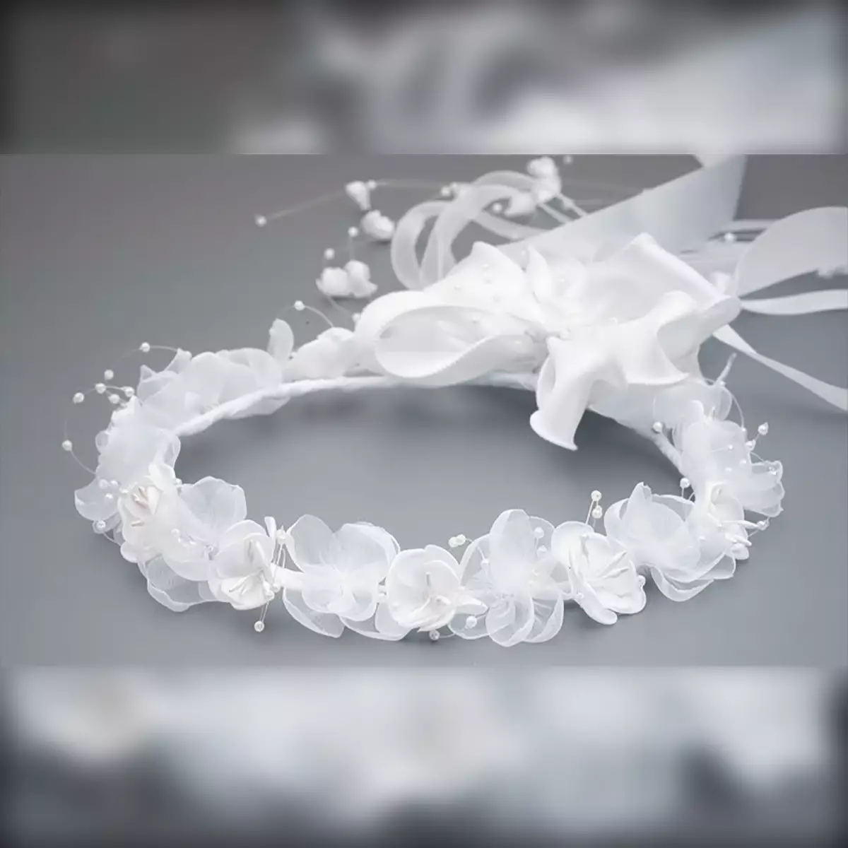 Ein wunderschöner Kommunionkranz für Mädchen DK-A022 des Herstellers Dalary. Verziert mit Kunstblumen in der Farbe weiß und mit kleinen Perlen bestückt. Auf der Rückseite befindet sich eine handgefertigte Schleife aus Organza. Dieses Haarschmuck wurde speziell für die Erstkommunion und für Blumenmädchen entworfen. Die künstlichen Blumen, aus denen dieser Kranz besteht, wurden mit höchster Präzision und Liebe in Handarbeit gefertigt!
