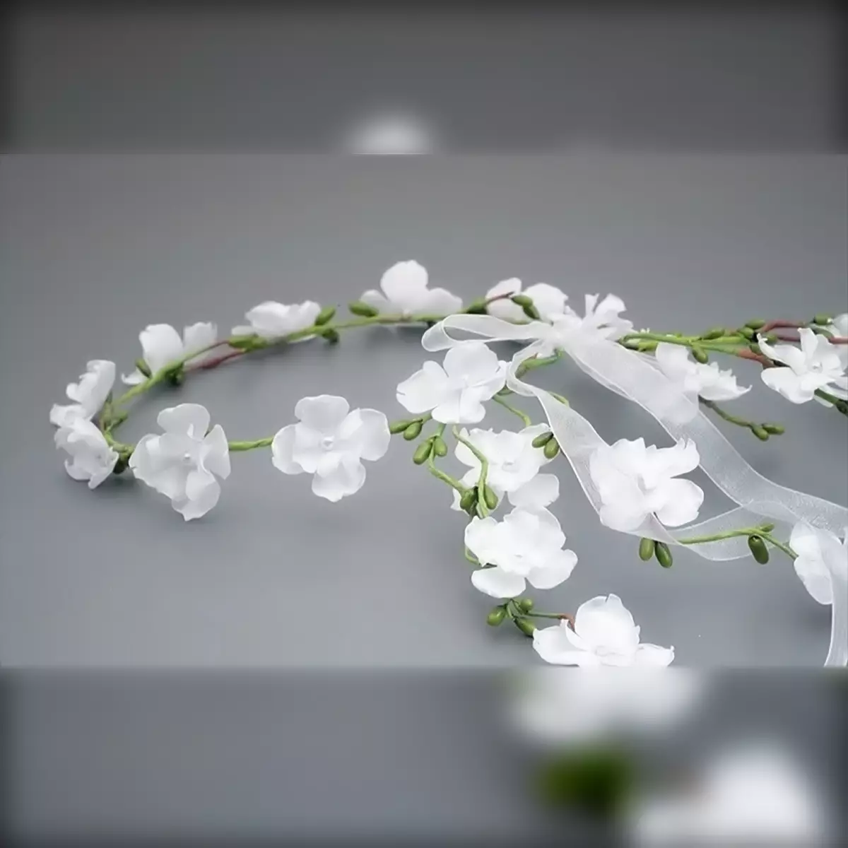 Ein wunderschöner Kommunionkranz DK-A035 von Dalary. Verziert mit Blumen in der Farbe weiß, grünen Knospen und einer Perle im Blütenstempel. Mit einer transparenten Schleife aus Organza hinten. Ein Kommunionkranz aus Kunstblumen ist eine tolle Alternative zu herkömmlichen Kränzen aus frischen Pflanzen. Dieses Haarschmuck wurde speziell für die Erstkommunion und für Blumenmädchen entworfen. Die Kunstblumen, aus denen dieser Kranz besteht, wurden mit höchster Präzision und Liebe in Handarbeit gefertigt!