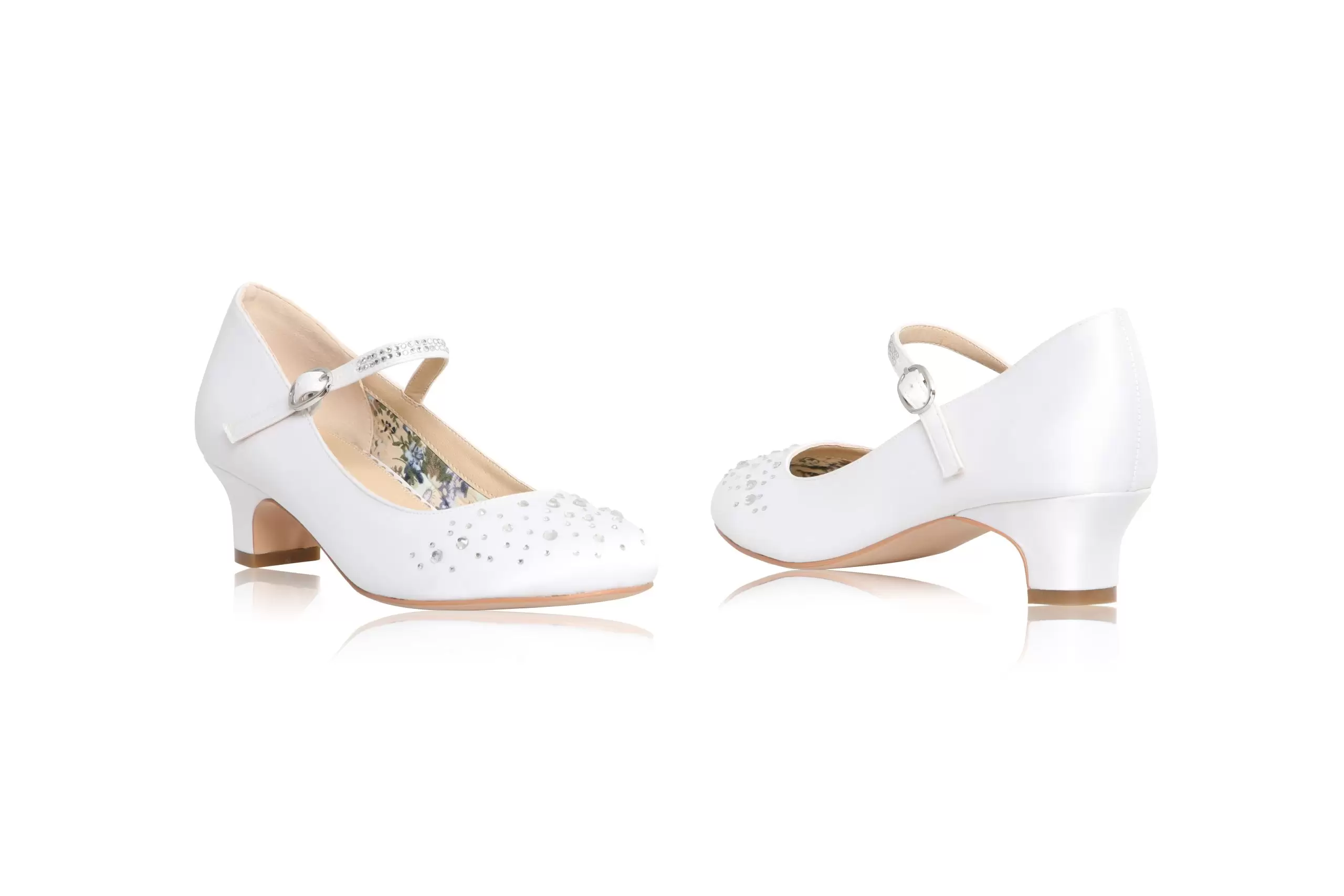 Die Ava Kommunionschuhe von The Perfect Bridal Company sind elegante weiße Satinpumps mit funkelnden Diamanten und einer verzierten Schnalle. Sie sind perfekt für den besonderen Anlass der Kommunion.
