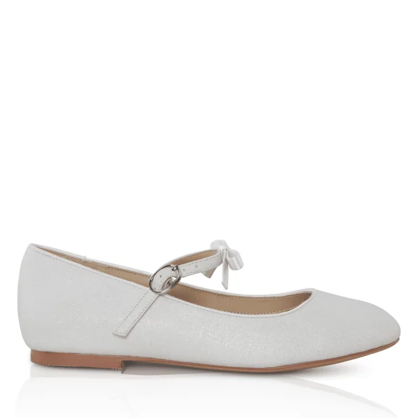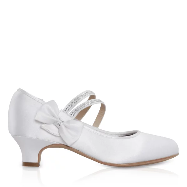Die eleganten Kommunionschuhe Felicity von The Perfect Bridal Company sind klassische Mary Jane-Schuhe aus weichem Satin in Farbe Weiß. Die süße Schleife aus Satin mit kleinen Kristallsteinen sorgt für das gewisse Etwas und verleiht diesen Kinderschuhen etwas Festliches. Ideal für die Erstkommunion oder als Blumenmädchen-Schuhe. Die Kinderschuhe Felicity haben einen kleinen Trichterabsatz und einen Knöchelriemen für einen sicheren Sitz. Dadurch sind sie sehr komfortabel zu tragen und wunderschön zugleich. Deine Prinzessin wird sich sehr wohl in ihnen fühlen und elegant aussehen.