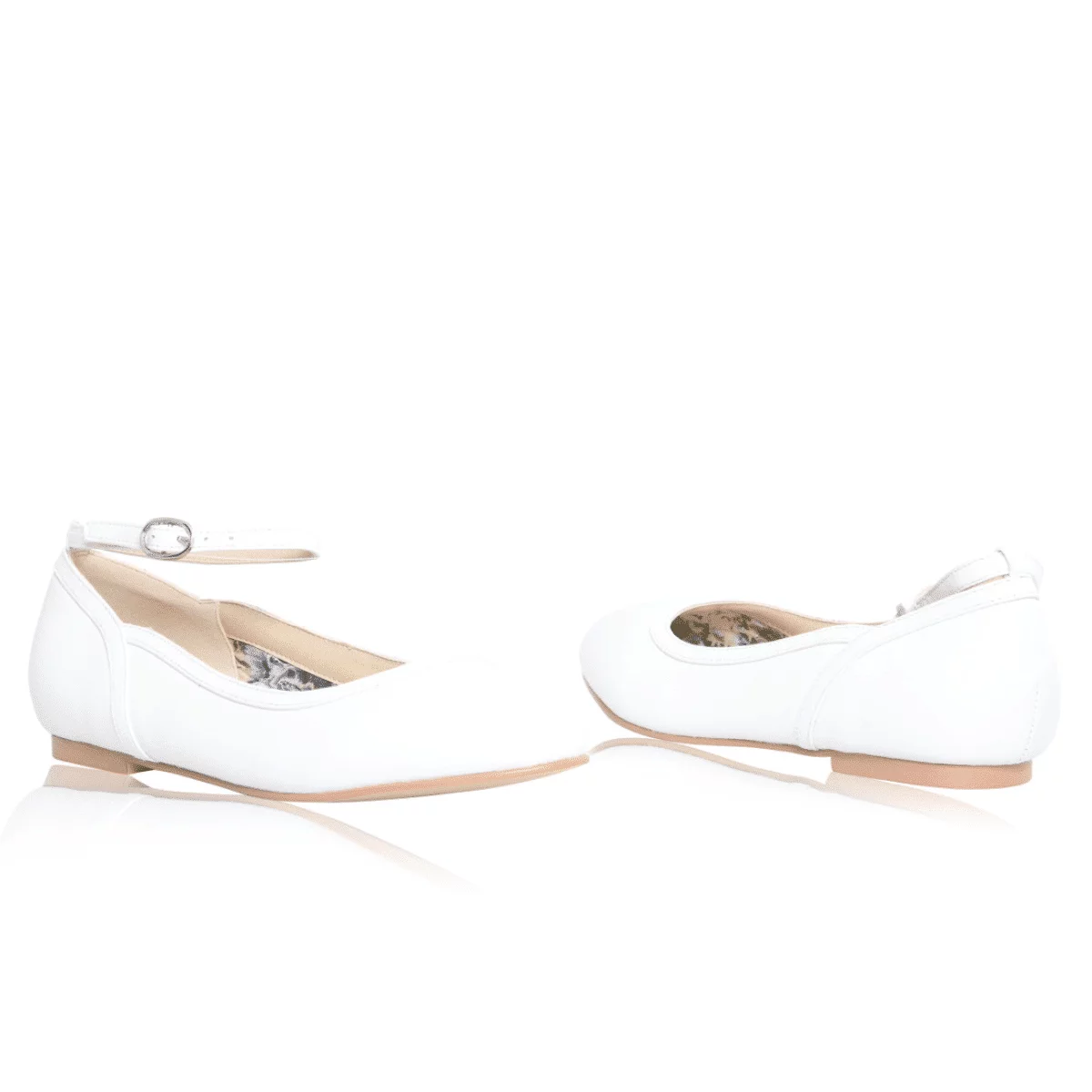 Besonders bequeme Kommunionschuhe Hanna von The Perfect Bridal Company mit einem flachen Absatz. Diese Kinderschuhe sind aus Leder in Farbe Weiß hergestellt und dadurch besonders bequem. Ein Modell für besondere Anlässe wie Kommunion oder Hochzeit (Blumenmädchen-Schuhe). Diese zarten Ballerinas sind sehr bequem zu tragen und perfekt für Kinder geeignet.