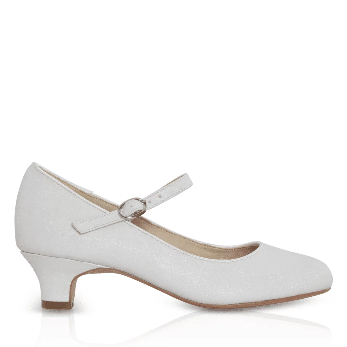 Elegante Kinderschuhe Kylie von The Perfect Bridal Company weiß schimmerndem Glitzerstoff. Dank dem robusten kleinen Trichterabsatz und einem Knöchelriemen sind diese Schuhe besonders bequem und zuverlässig. Dieses Modell ist für besondere Anlässe wie die Hochzeit (Blumenmädchen-Schuhe) oder Erstkommunion geeignet. Deine Prinzessin wird sich mit diesen Kommunionschuhen sehr wohl fühlen!