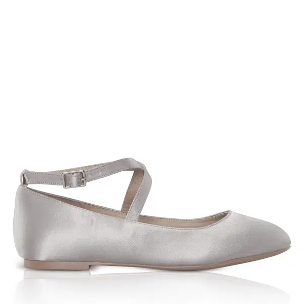 Elegante Kommunionschuhe Lena aus hochwertigem Satin in Farbe Silber von The Perfect Bridal Company. Klassische flache Mädchenschuhe mit stylischen Kreuzriemen mit silberner Schnalle über dem Knöchel. Diese zarten Schuhe sind besonders für Anlässe wie die Erstkommunion oder Hochzeit (Blumenmädchen-Schuhe) geeignet. Dank dem flachen Absatz und dem schimmernden Satin sind die Schuhe Lena besonders bequem und elegant zugleich. Die passenden Kommunionschuhe oder Blumenmädchen-Schuhe für deine Prinzessin!