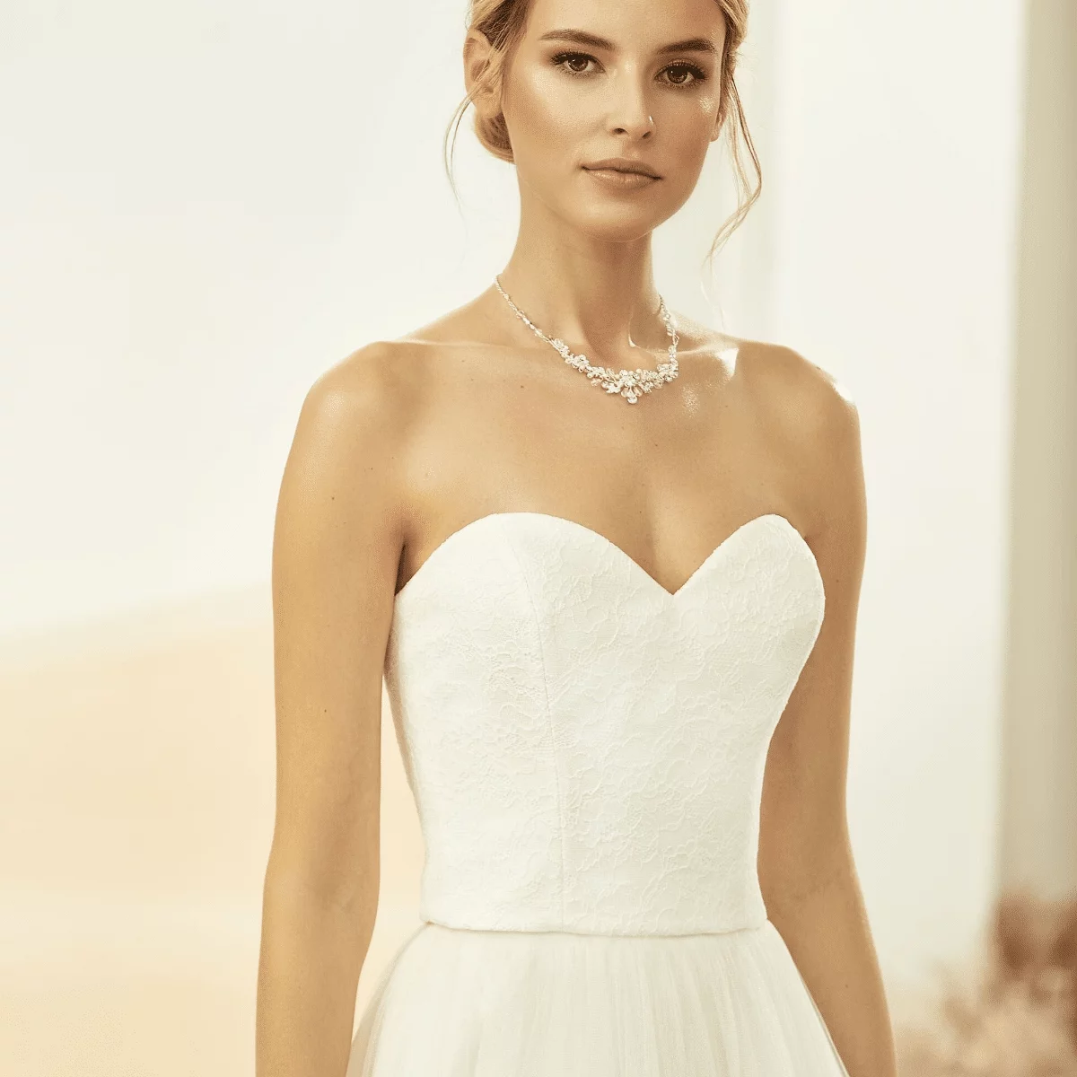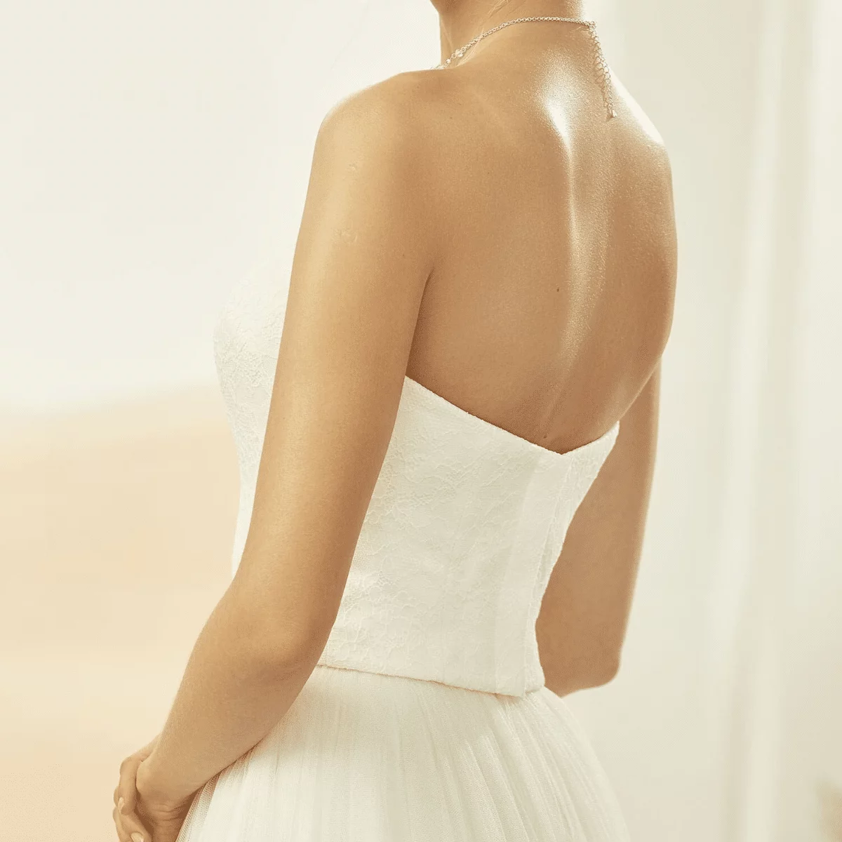 Korsett E321 von Avalia (Bianco Evento) aus hochwertiger Spitze. Der Korsett mit einem Sweetheart-Ausschnitt und tiefem Rücken sorgt für eine hohe Statur und verfügt über ein rutschfestes, elastisches Innenbrustband. Dank dem unauffälligen Reißverschluss im Rückenbereich lässt sich die Corsage besonders bequem öffnen und schließen. Dieser Korsett E321 ist eine ideale Ergänzung zum Brautkleid in Farbe Ivory oder Weiß und ein exklusives Accessoire für die Hochzeit. Verfügbar in den Farben Ivory (Creme). Hohe Qualität, sorgfältig entworfen und produziert in der Europäischen Union.