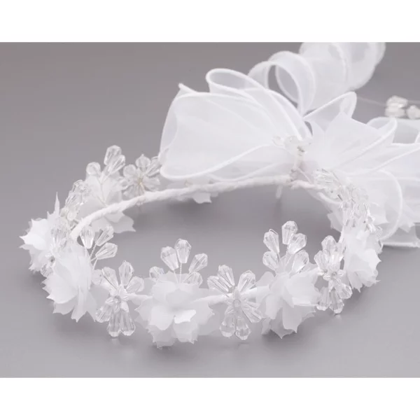 Schöner Kommunion Haarschmuck Dutt DK-A8 für Mädchen von der Marke Dalary. Dekorativer Haarkranz zum Befestigen am Haar mit weißen und rosa Blumen, Perlen, Kristallen und einem weißen Band verziert. Dieser Haarschmuck ist eine ideale Ergänzung zum Kommunion- oder Blumenmädchen-Outfit. In Kombination mit einem Kommunionkleid und anderen Kommunion-Accessoires kommt dieses Schmuckstück besonders zur Geltung.