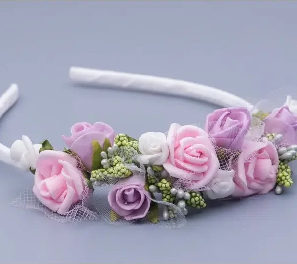 Schöner Haarschmuck DK-A81 für Mädchen von der Marke Dalary. Dekoratives Stirnband / Haarbogen zum Befestigen am Haar mit rosa und weißen Blüten und grünen Blättern verziert. Dieser Haarschmuck ist eine ideale Ergänzung zum Kommunion- oder Blumenmädchen-Outfit. In Kombination mit einem Kommunionkleid und anderen Kommunion-Accessoires kommt dieses Schmuckstück besonders zur Geltung.