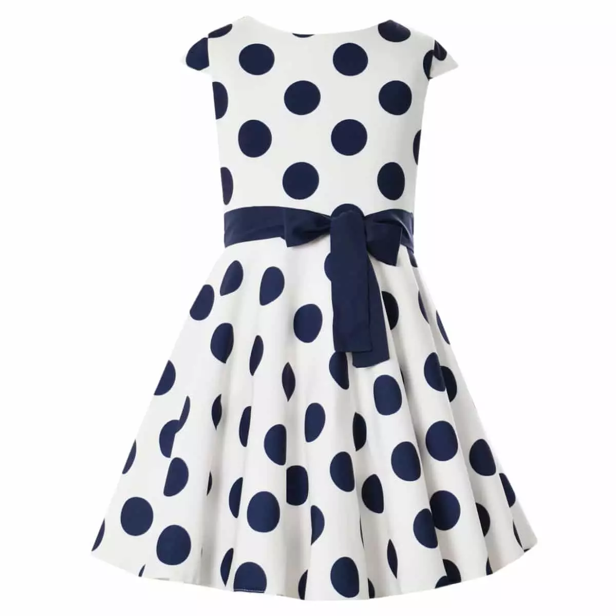 Festliches Mädchenkleid DK-D200 in Farbe Weiß mit blauen Punkten. Knielanges Design mit kurzen Ärmeln einer trendigen runden Form. Hergestellt aus hochwertigem Satin mit Baumwollfutter, welches mit Tüll veredelt ist. In der Taille wird das Kleid mit einem marineblauen Band gebunden, welcher vorne bzw. hinten mit einer spektakulären Schleife versehen ist. Geeignet für die Einschulung, als Blumenmädchen-Kleid, Jugendweihe oder als stylisches Party-Sommerkleid. Am Rücken hat das Kleid einen verdeckten Reißverschluss.