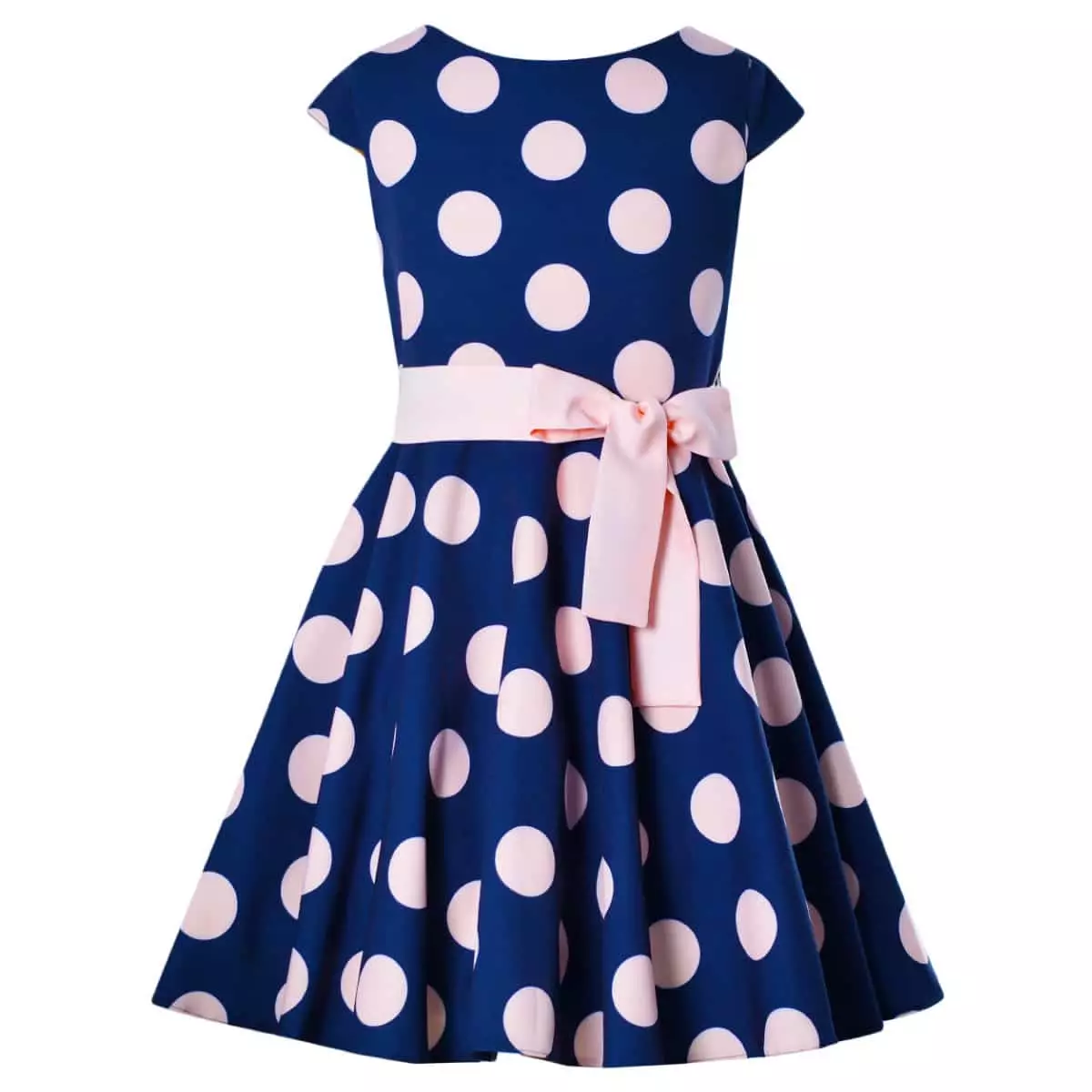 Festliches Mädchenkleid DK-D204 in Farbe Marineblau mit rosa Punkten. Knielanges Design mit kurzen Ärmeln einer trendigen runden Form. Hergestellt aus hochwertigem Satin mit Baumwollfutter, welches mit Tüll veredelt ist. In der Taille wird das Kleid mit einem rosa Band gebunden, welcher vorne bzw. hinten mit einer spektakulären Schleife versehen ist. Geeignet für die Einschulung, als Blumenmädchen-Kleid, Jugendweihe oder als stylisches Party-Sommerkleid. Am Rücken hat das Kleid einen verdeckten Reißverschluss.