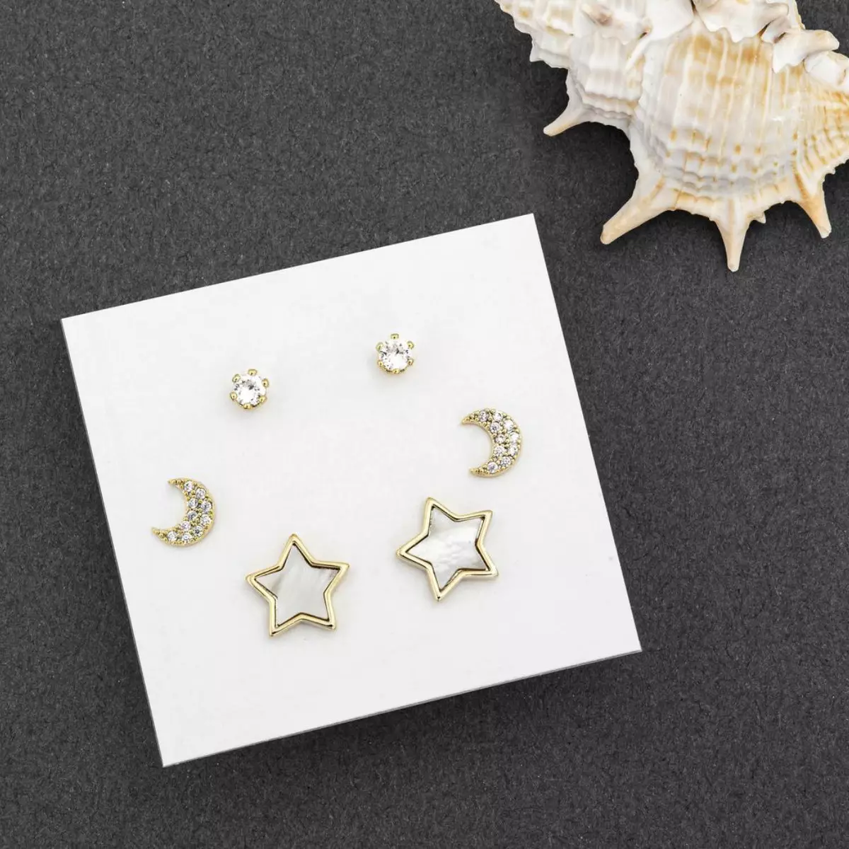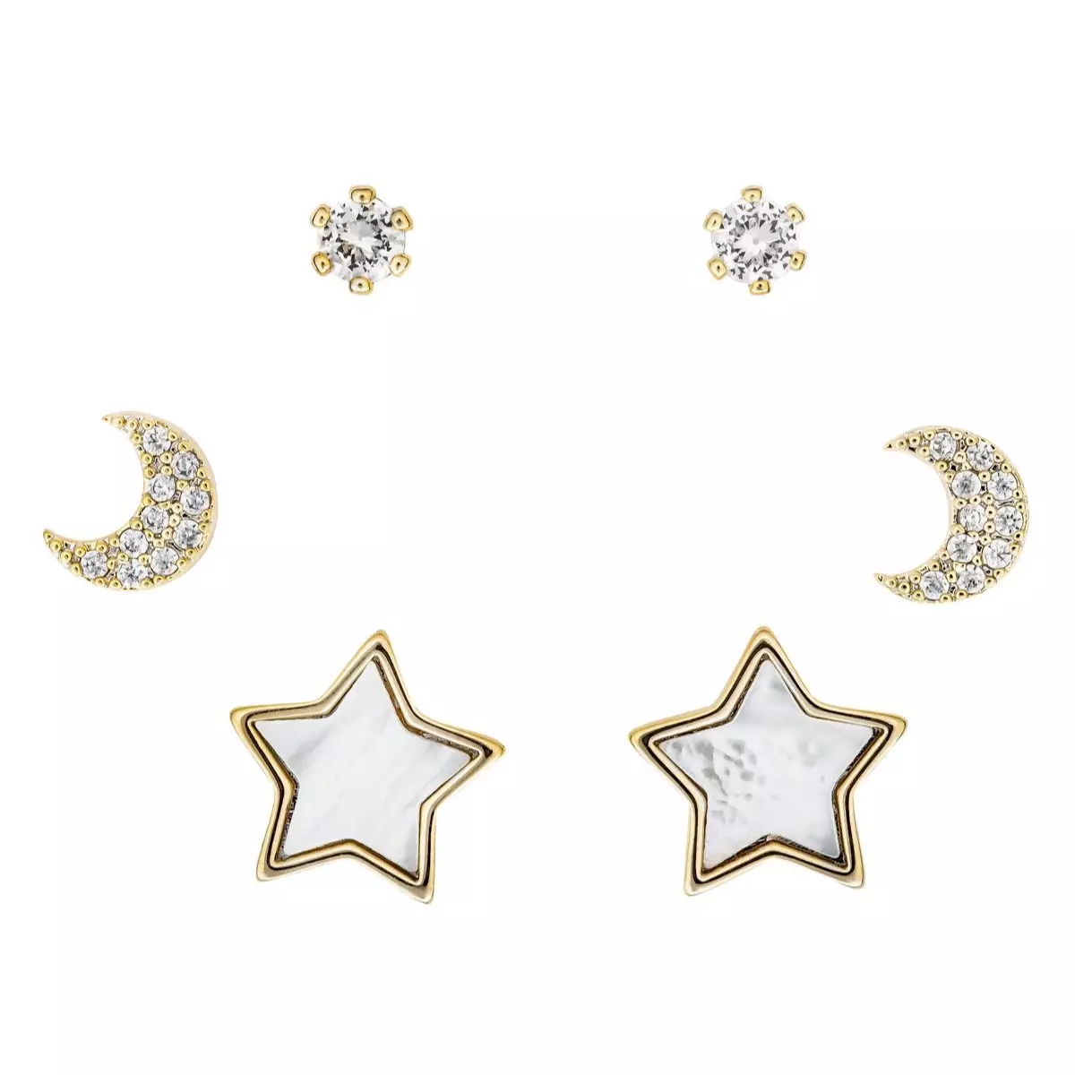 Ein schönes Ohrringe-Set ER61027 aus der Kollektion 2023 mit stylischen Sonne, Mond und Sterne Motiven! Bestehend aus drei verschiedenen Ohrsteckern in der Farbe Gold, die mit kleinen funkelnden Kristallen verziert sind. Kombiniere die einzelnen Ohrringe frei nach deinem Wunsch. Geeignet als eleganter Schmuck für die Hochzeit, für besondere Anlässe oder auch für den Alltag. Das Metallteil ist vergoldet (nickel- und bleifrei) und daher auch für empfindliche Haut geeignet.