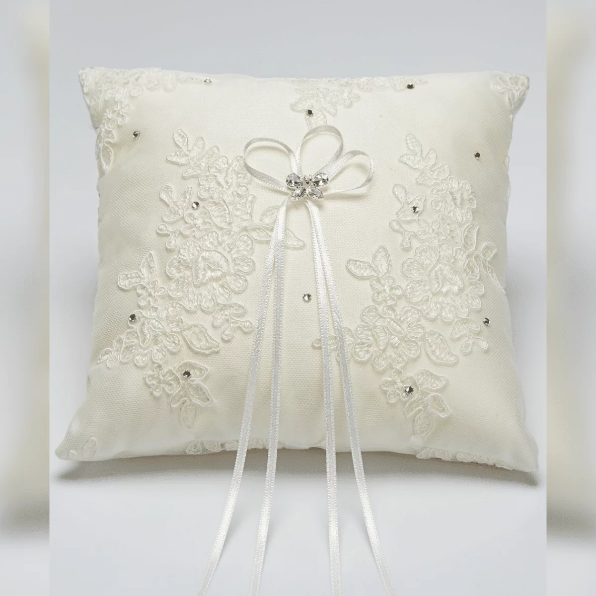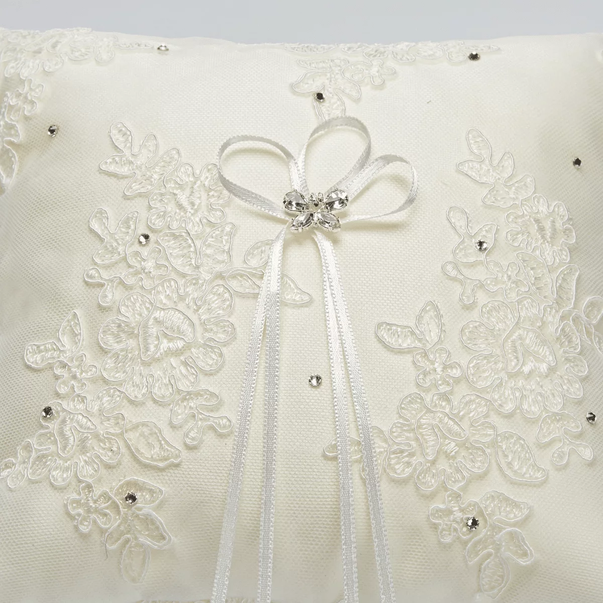 Elegantes Ringkissen K2 von Avalia (Bianco Evento) aus hochwertigem Satin und Spitze mit Swarovski Kristallen handverziert. Das Kissen kommt wahlweise in den Farben Ivory (Elfenbeinfarbe) und Weiß und ist mit zarten Swarovski Kristallsteinen und einem Kristallschmetterling verziert. Die Ringe werden mit einem Band aus Satin befestigt, welches am Kissen eingenäht ist. Sorgfältig entworfen und hergestellt in der Europäischen Union.