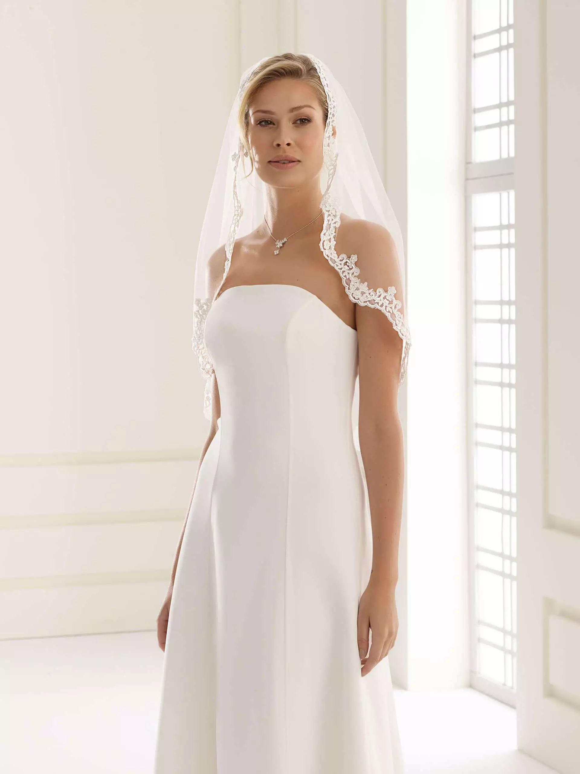 Exklusive Accessoires für die Braut mit hoher Qualität online kaufen. Wunderschöner Schleier S106 mit Spitzenkante, handverziert mit Glasperlen. Der Schleier S106 ist in der Farbe Creme (Ivory) lieferbar und passt hervorragend zu einem Brautkleid in der Farbe Ivory. Es handelt sich um ein klassisches Modell Diamond Tüll in 80 cm Länge. Dieser Schleier wird am Kamm streckfertig geliefert. Hohe Qualität, sorgfältig entworfen und produziert in der Europäischen Union.