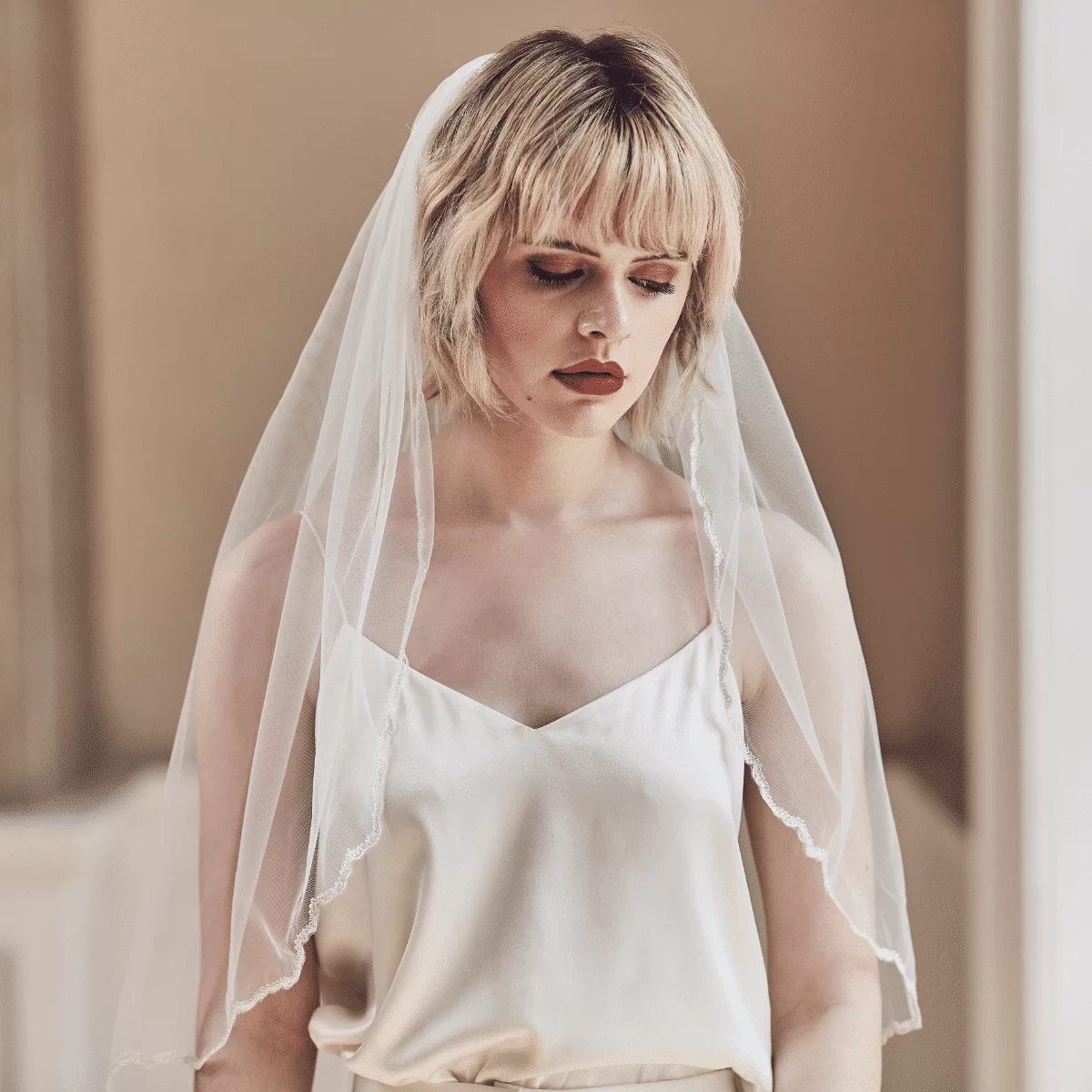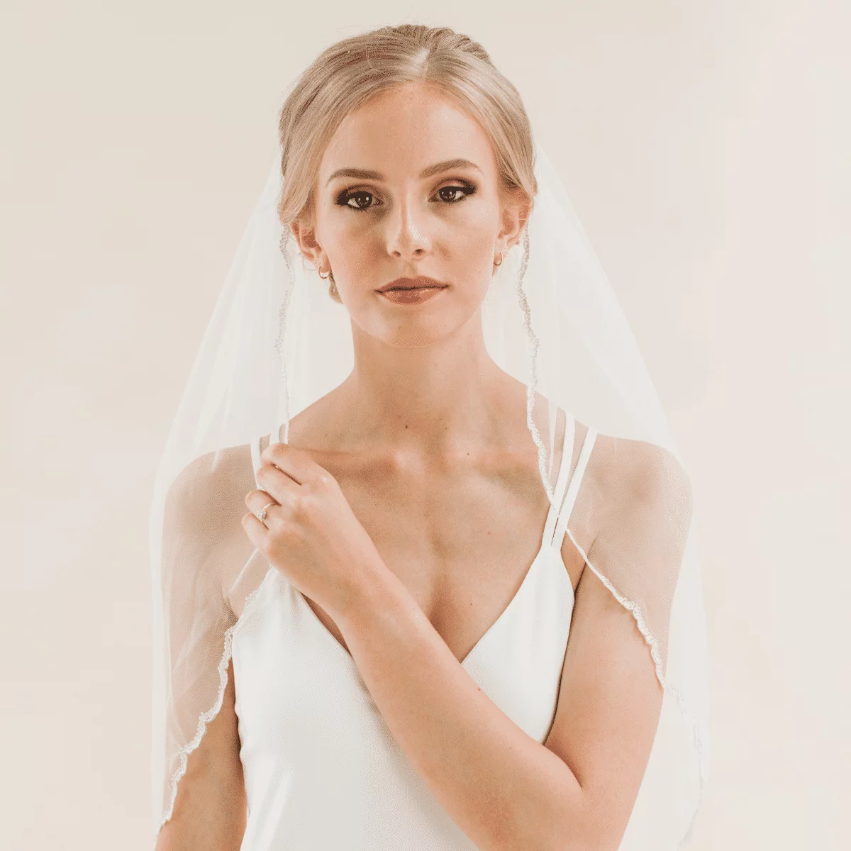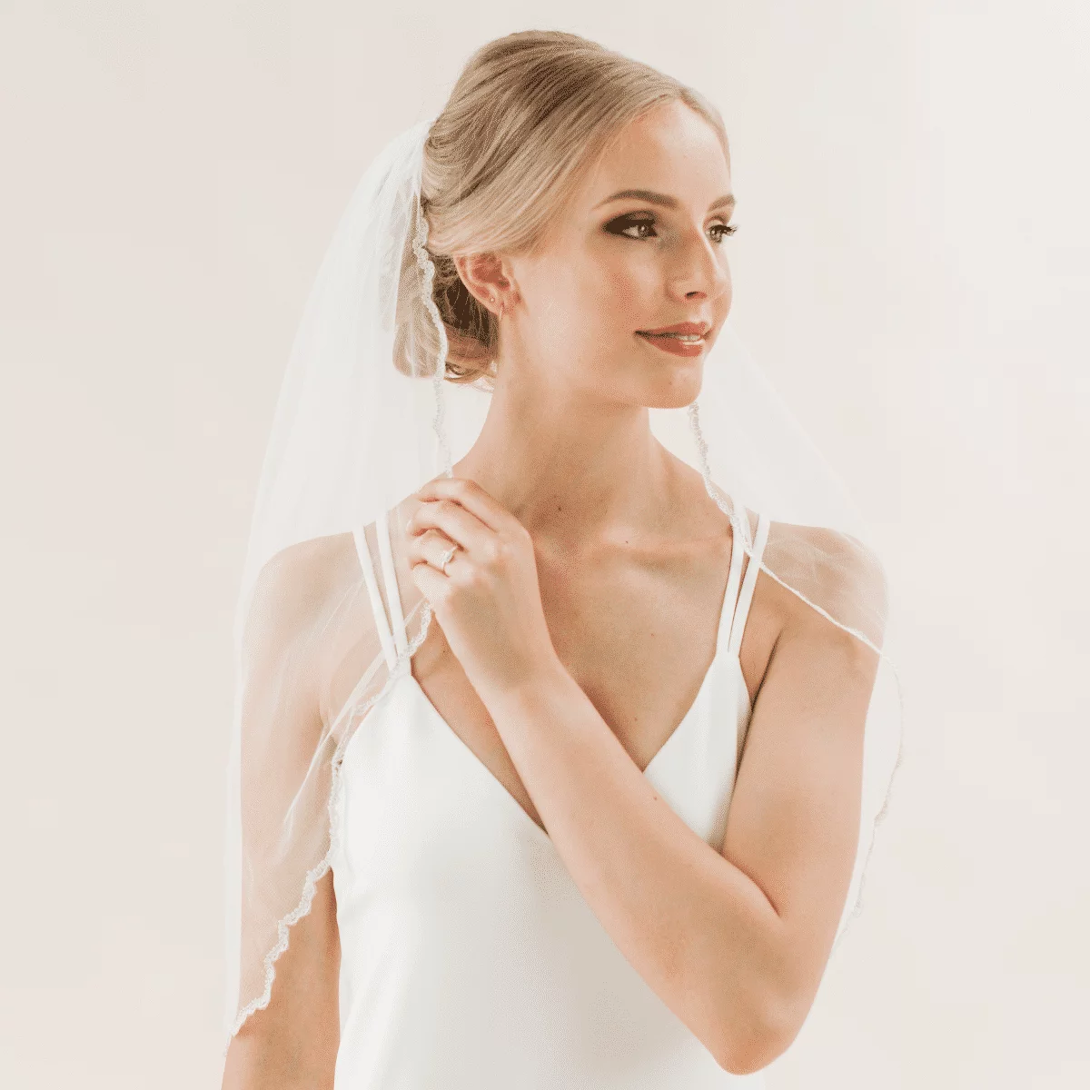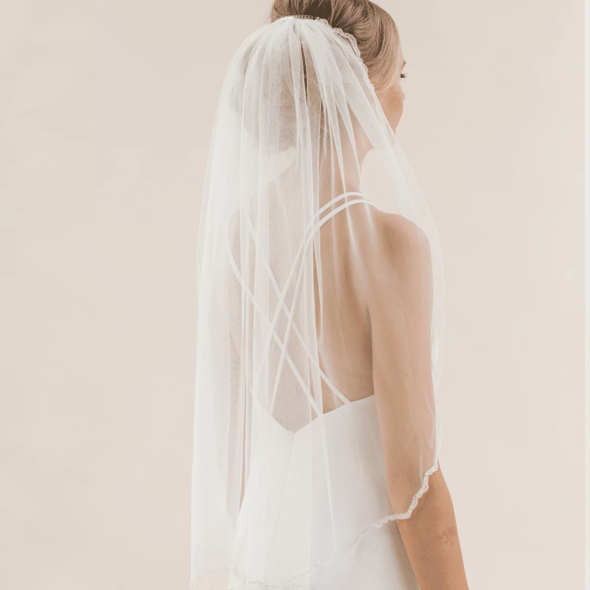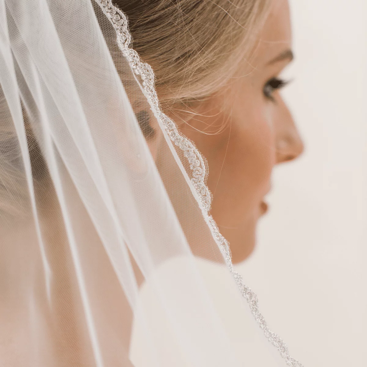 Der wunderschöne Schleier Triora von Rainbow Club (Elsa Coloured Shoes) aus hochwertigem Tüll. Der Schleier Triora ist in der Farbe Ivory lieferbar und passt hervorragend zu einem Brautkleid in der Farbe Weiß oder Ivory mit zarter Kante aus Spitze. Es handelt sich um ein klassisches Modell aus Tüll in kurzer Ausführung.
