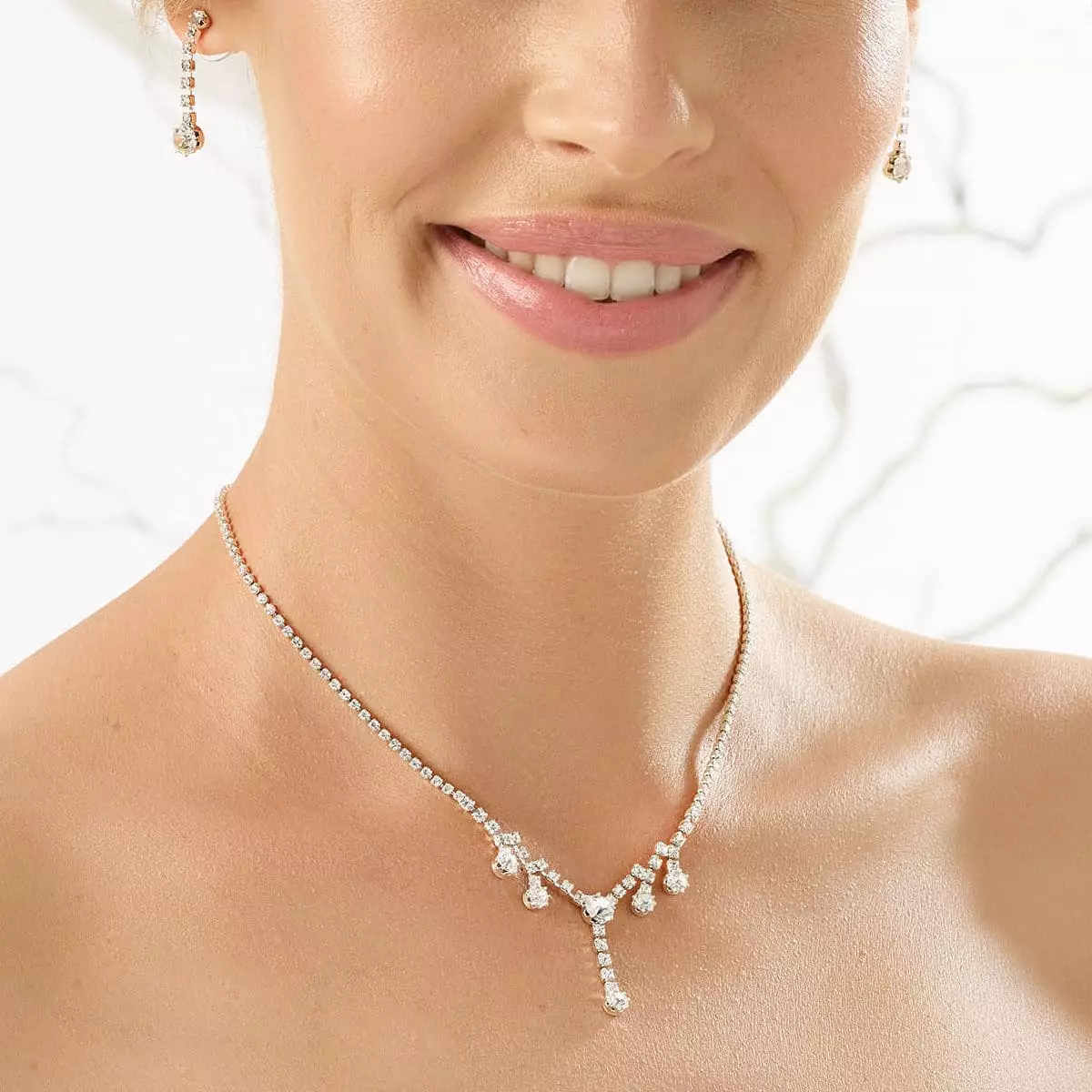 Dieses wunderschöne Schmuckset N20 von Avalia (Bianco Evento) besteht aus Ohrringen und Halskette in der Länge 38 cm, die um 7 cm erweiterbar ist. Schmuckset N20 ist hochwertig verarbeitet und mit Strass und Kristallsteinen dekoriert. Dieses elegante Schmuckset wird dein Brautlook verschönern und unterzeichnen. Außerdem ist der Metallteil des Sets versilbert und nickelfrei (allergiefrei) und deswegen passt es auch zur empfindlichen Haut. Schmuckset N20 wird in einem eleganten Schmucketui geliefert. Wenn du dich für dieses Schmuckset entscheidest, findest du dazu passendes Diadem „Diadem D26“ ebenfalls auf bystep.de.