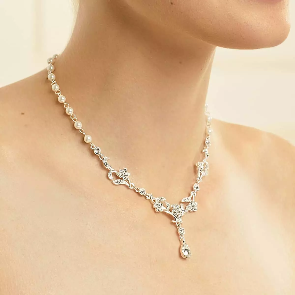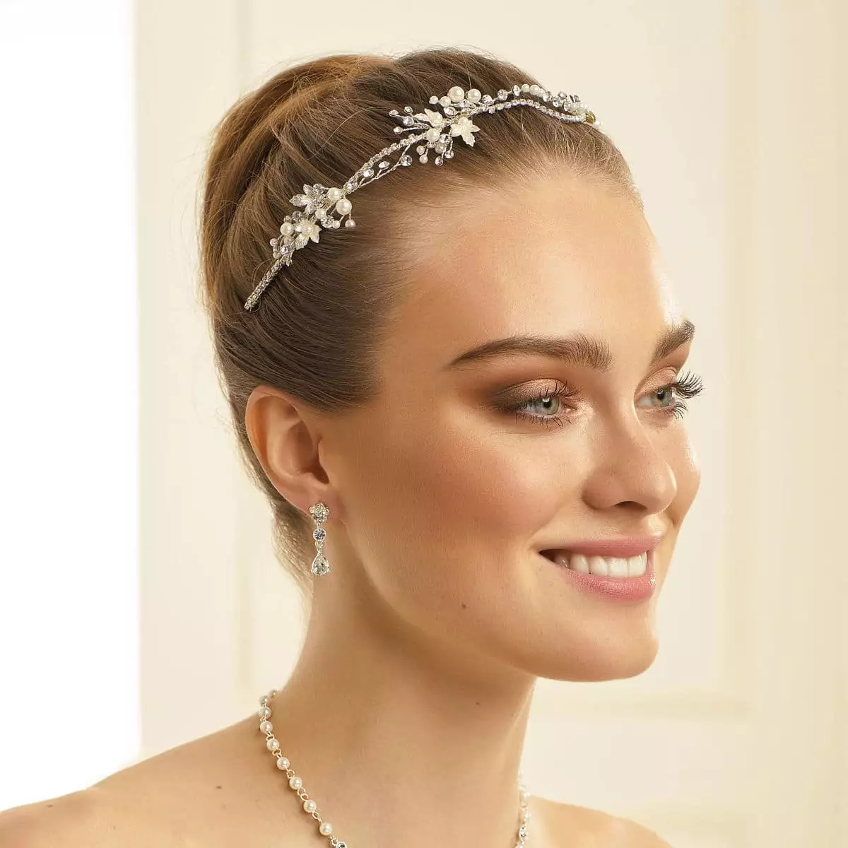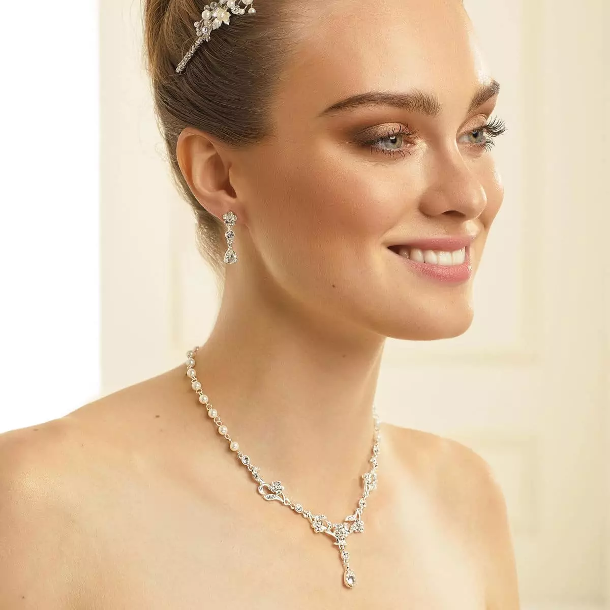 Dieses wunderschöne Schmuckset N34 von Avalia (Bianco Evento) besteht aus Ohrringen und Halskette in der Länge 38 cm, die um 7 cm erweiterbar ist. Schmuckset N34 ist hochwertig verarbeitet und mit Perlen und Kristallsteinen dekoriert. Dieses elegante Schmuckset wird dein Brautlook verschönern und unterzeichnen. Außerdem ist der Metallteil des Sets versilbert und nickelfrei (allergiefrei) und deswegen passt es auch zur empfindlichen Haut. Schmuckset N34 wird in einem eleganten Schmucketui geliefert. Wenn du dich für dieses Schmuckset entscheidest, findest du dazu passendes Diadem „Diadem D45“ ebenfalls auf bystep.de.