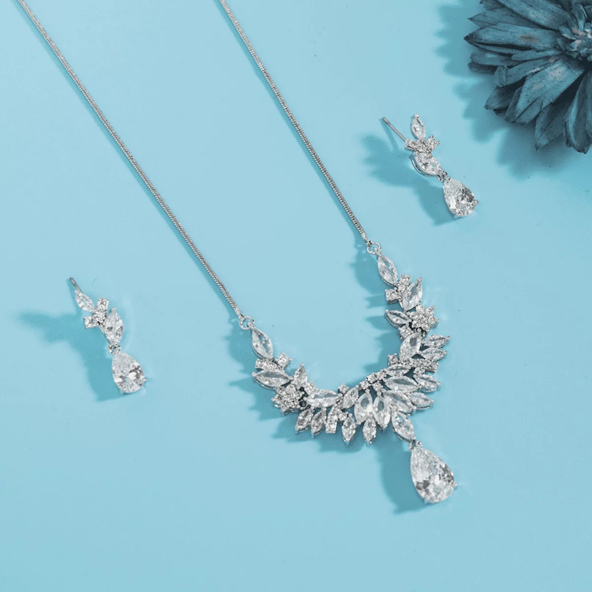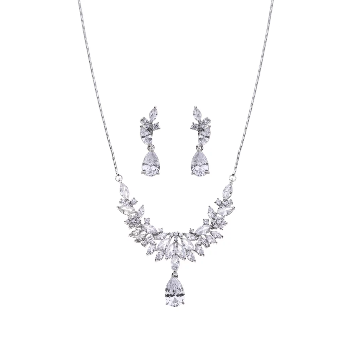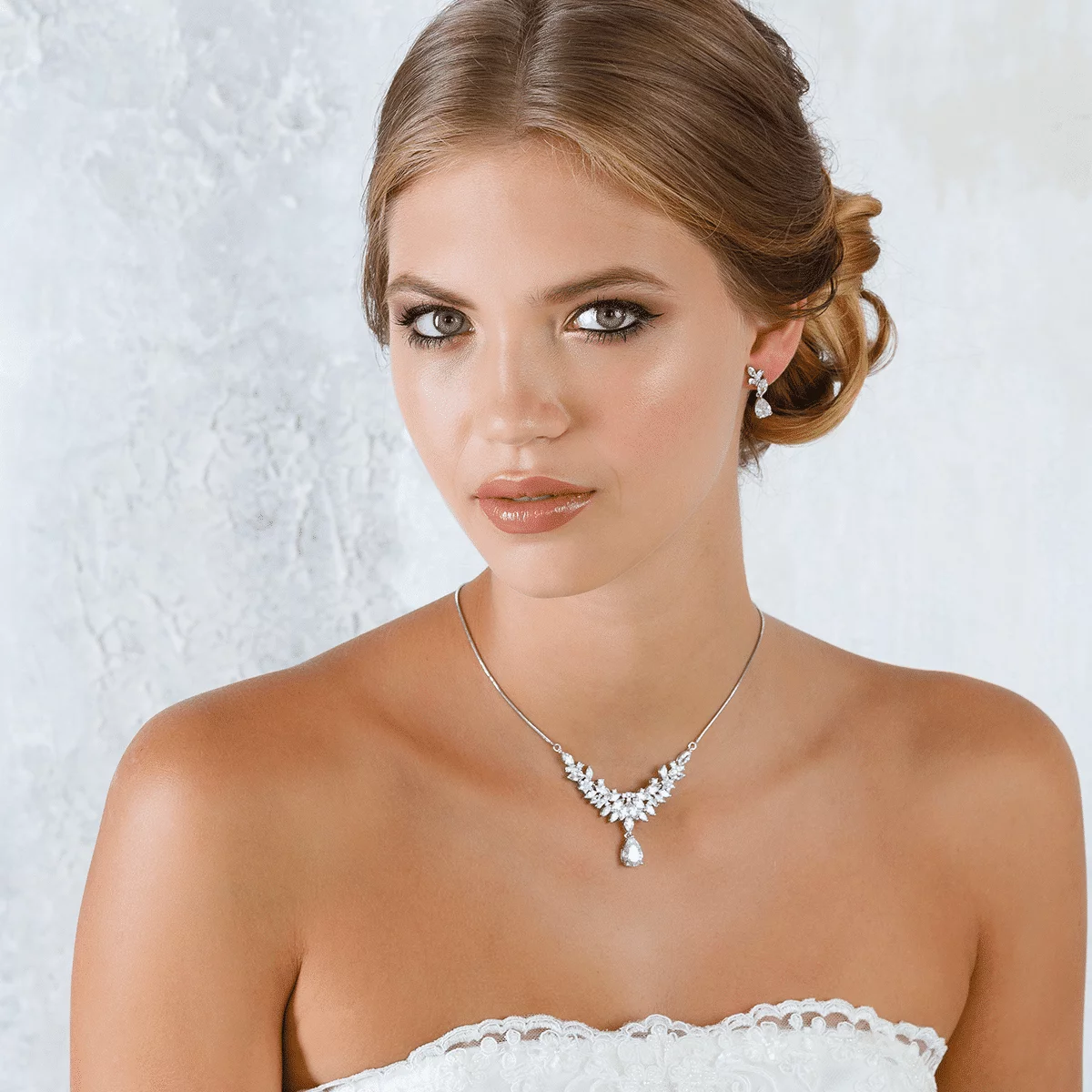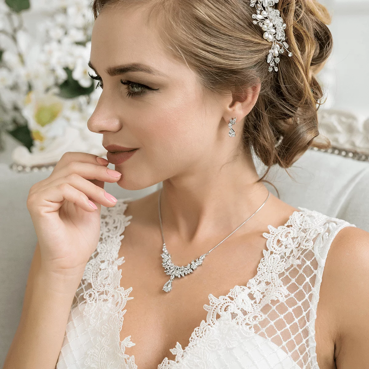 Das wunderschöne Schmuckset JN080 von G. Westerleigh ist mit Cubic Zirconia Kristallen verziert, welche in aufwändiger Handarbeit eingearbeitet wurden. Außerdem ist das Brautschmuck-Set mit Rhodium bedeckt und antiallergen (nickel- und bleifrei). Es passt daher auch zur empfindlichen Haut. Das Brautschmuck-Set JN080 besteht aus Ohrringen und Halskette und wird im eleganten Schmucketui geliefert. Die Länge der Halskette kann individuell verändert werden. Eine ideale Wahl für Hochzeiten und besondere Anlässe.