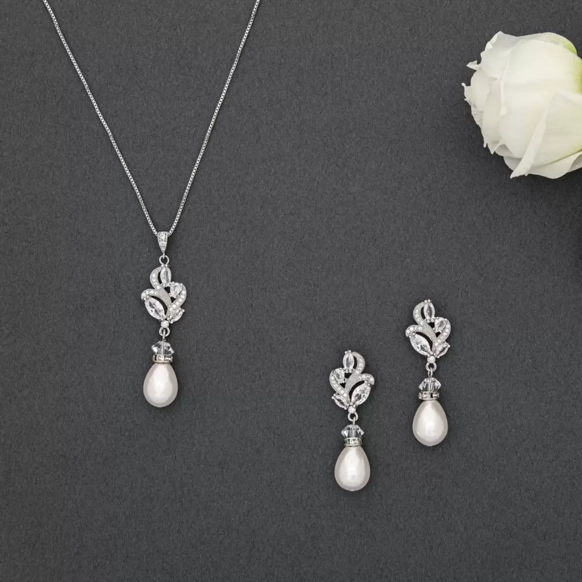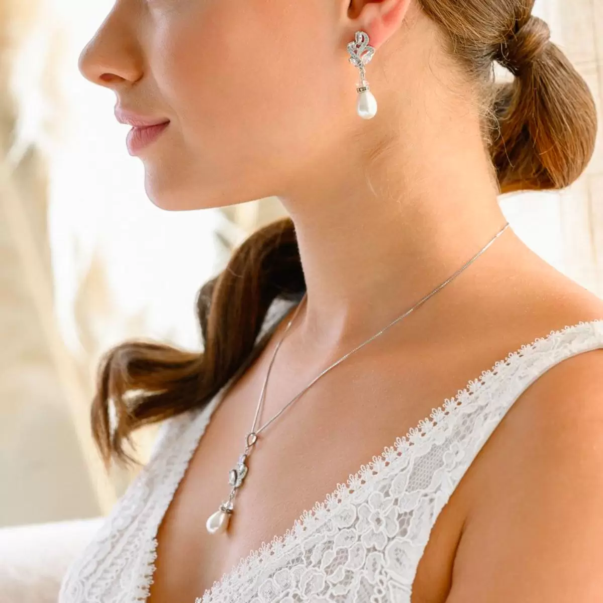 Wunderschönes Schmuckset JS211212 von G. Westerleigh. Verziert mit hochwertigen Zirkonia-Kristallen und cremefarbenen Perlen. Das Schmuckset besteht aus nicht allergischen Materialien (nickel- und bleifrei) und ist rhodiniert. Die Länge der Kette ist verstellbar. Das Set JS211212 besteht aus Ohrringen und Halskette und wird im eleganten Schmucketui geliefert. Das Schmuckset sieht einfach hinreißend aus! Bestens geeignet als Hochzeitsschmuck für die Braut oder als Schmuck für besondere Anlässe. Ein echter Hingucker!