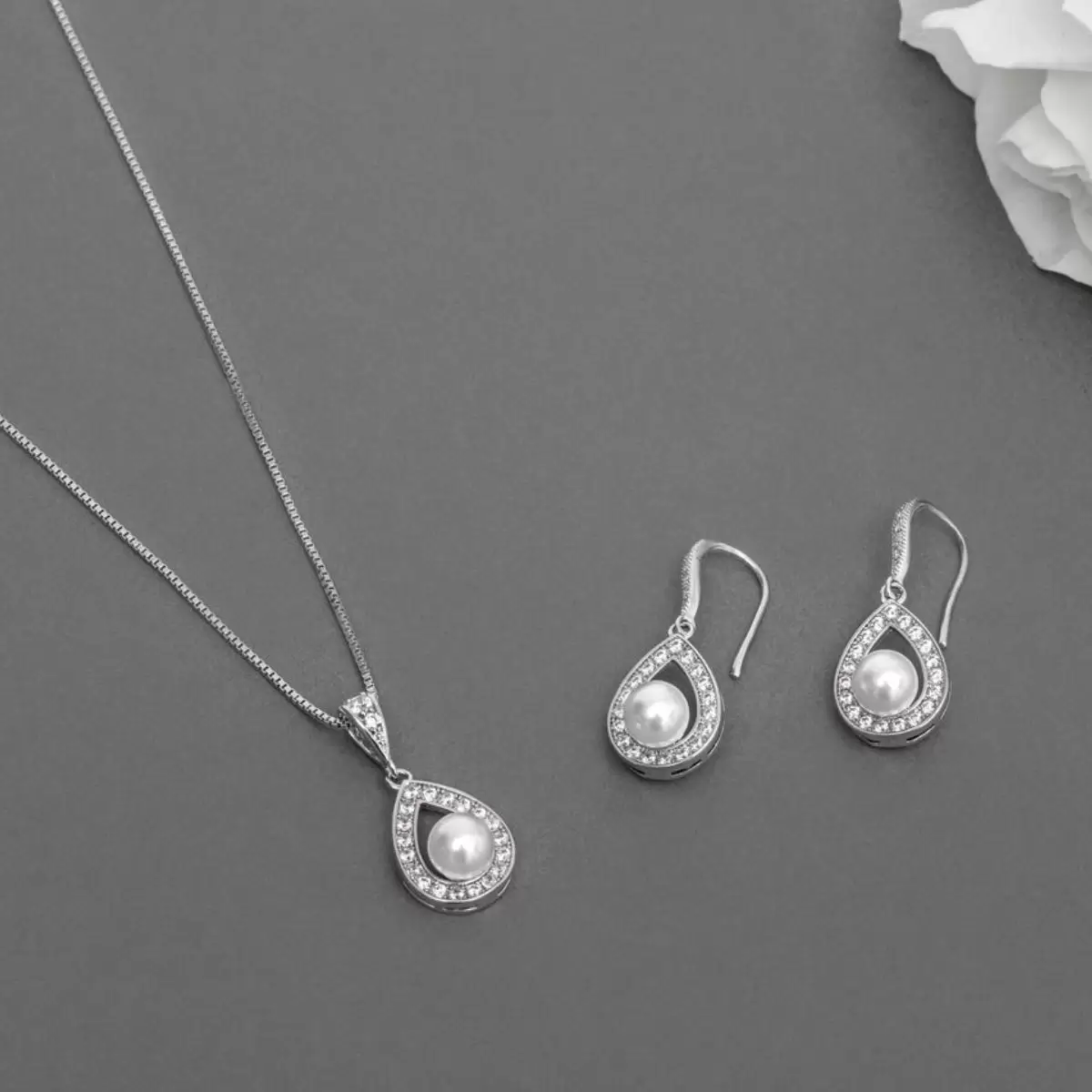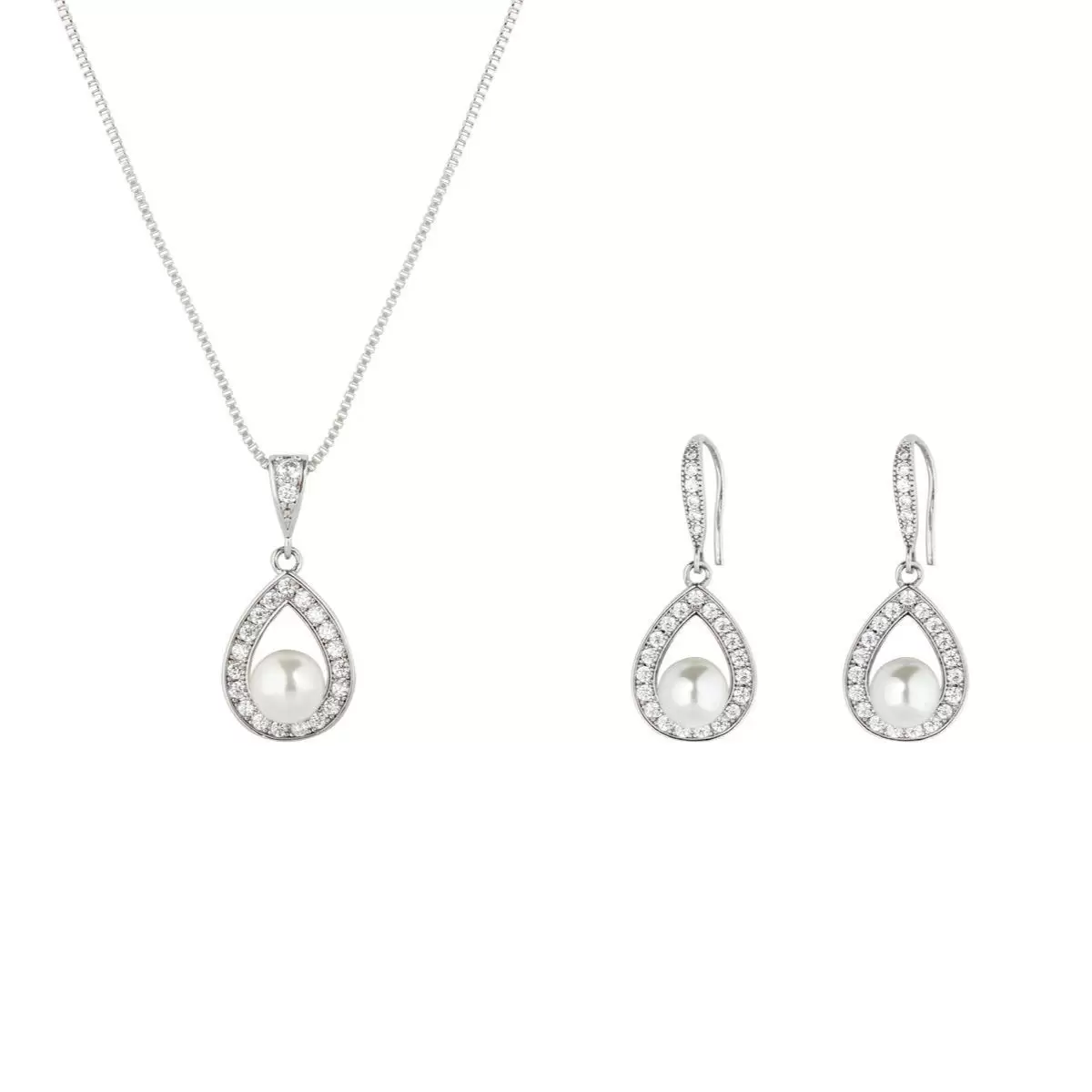 Elegantes Schmuckset JS2126 von G. Westerleigh. Verziert mit hochwertigen Zirkonia-Kristallen und cremefarbenen Perlen. Das Schmuckset besteht aus nicht allergischen Materialien (nickel- und bleifrei) und ist rhodiniert. Die Länge der Kette ist verstellbar. Das Set JS2126 besteht aus Ohrringen und Halskette und wird im eleganten Schmucketui geliefert. Wunderschönes Brautschmuck-Set, das bei Hochzeiten und zu wichtigen Anlässen besonders zur Geltung kommt.