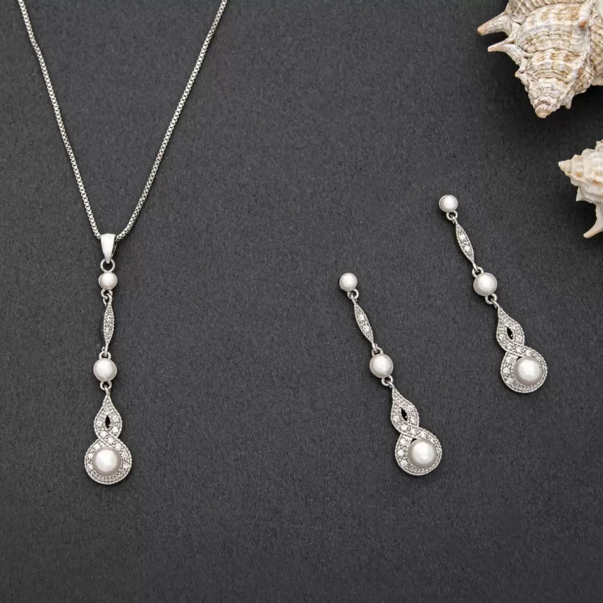 Exclusives Schmuckset JS220101 von G. Westerleigh. Verziert mit hochwertigen Zirkonia-Kristallen und cremefarbenen Perlen. Das Schmuckset besteht aus nicht allergischen Materialien (nickel- und bleifrei) und ist rhodiniert. Die Länge der Kette ist verstellbar. Das Set JS220101 besteht aus Ohrringen und Halskette und wird im eleganten Schmucketui geliefert. Dieses wunderschöne Brautschmuck-Set ist ein echter Hingucker! Aus hochwertigen Materialien in aufwendiger Handarbeit gefertigt.