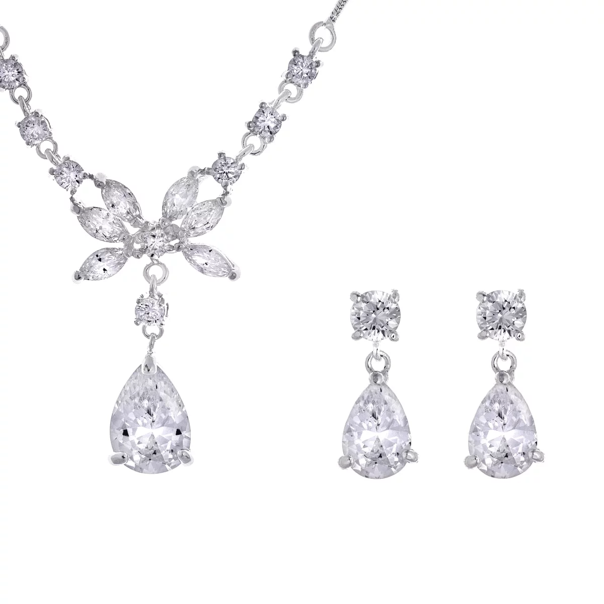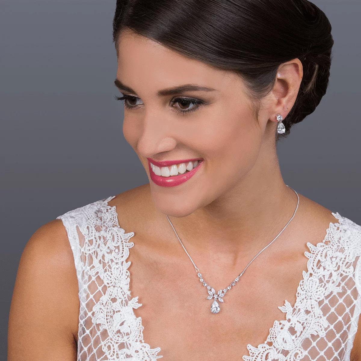 Das wunderschöne Schmuckset NO1513 von G. Westerleigh ist mit Cubic Zirconia Kristallen verziert, welche in aufwändiger Handarbeit eingearbeitet wurden. Außerdem ist das Brautschmuck-Set mit Silber bedeckt und antiallergen (nickel- und bleifrei). Es passt daher auch zur empfindlichen Haut. Das Brautschmuck-Set NO1513 besteht aus Ohrringen und Halskette und wird im eleganten Schmucketui geliefert. Die Länge der Halskette kann individuell verändert werden. Eine ideale Wahl für Hochzeiten und besondere Anlässe.