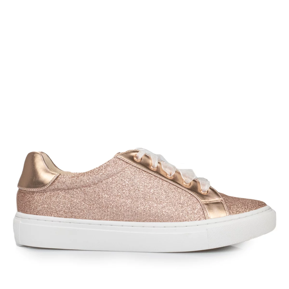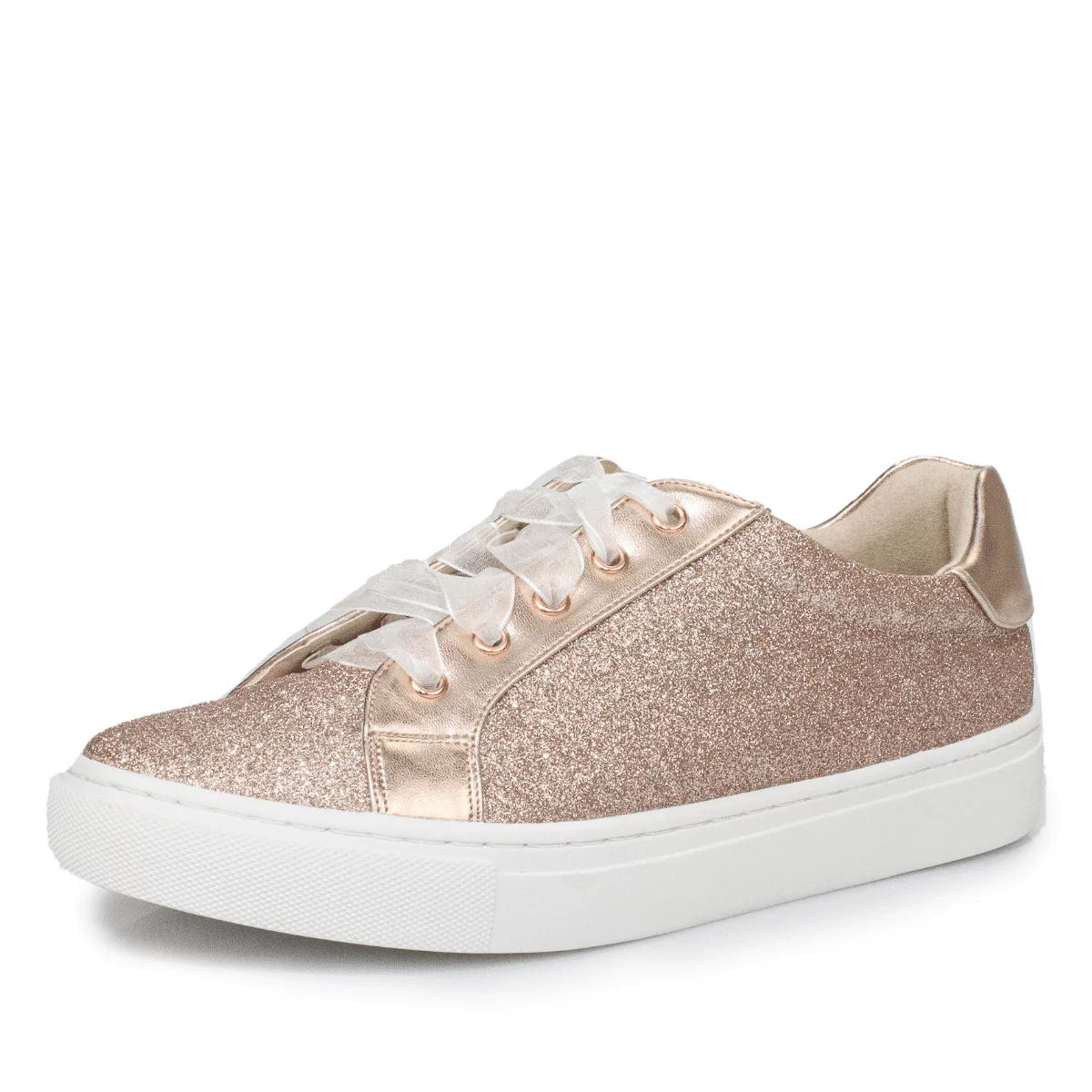 Die eleganten Sneaker 933 Rosé mit Glitzern aus der White Lady Kollektion sind besonders bequem und kommen in einem einzigartigen Look mit stylischen Glitzern in Farbe Roségold. Diese Sneaker sind aus Textil in Farbe Roségold gefertigt und mit Glitzern verziert. Dieses Modell ist besonders bequem, da die Decksohle innen gepolstert ist. Die Schuhe 933 Rosé mit Glitzern passen für normal weite Füße. Diese elegante Sneaker eignen sich als Braut-Sneaker oder Sneaker im Alltag!