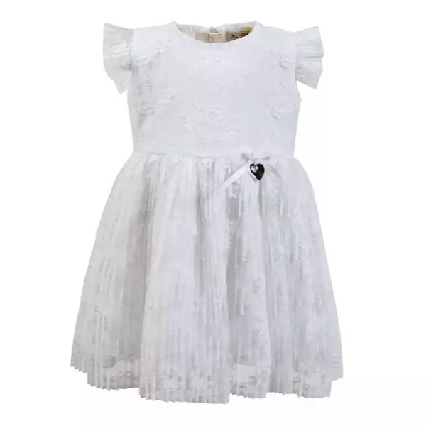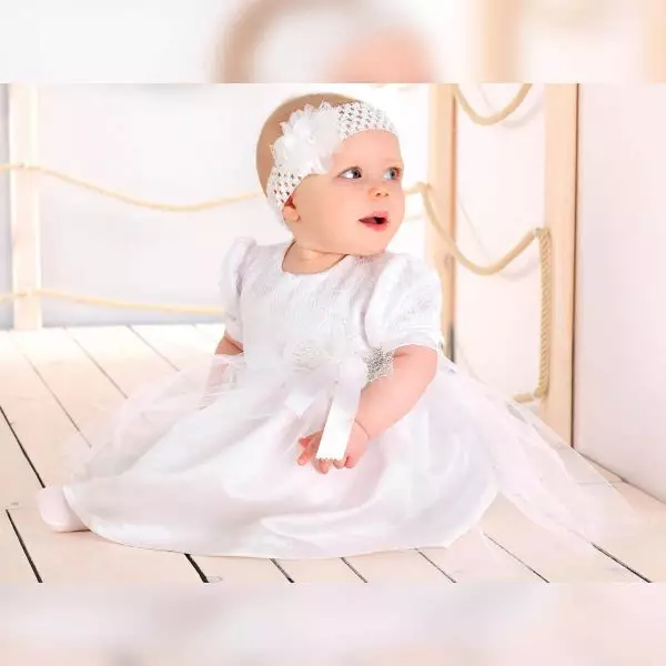 Elegantes Taufkleid DK-S101 von Dalary. Gefertigt aus Satin in Farbe Weiß, die Passe ist zusätzlich mit zarter Spitze besetzt. Ein passendes Stirnband mit Blumenschmuck wird mitgeliefert. Das Kleid hat kurze Ärmel und wird hinten mit einem Reißverschluss verschlossen. Zum Kleid empfehlen wir einen Bolero oder Mantel für Mädchen.