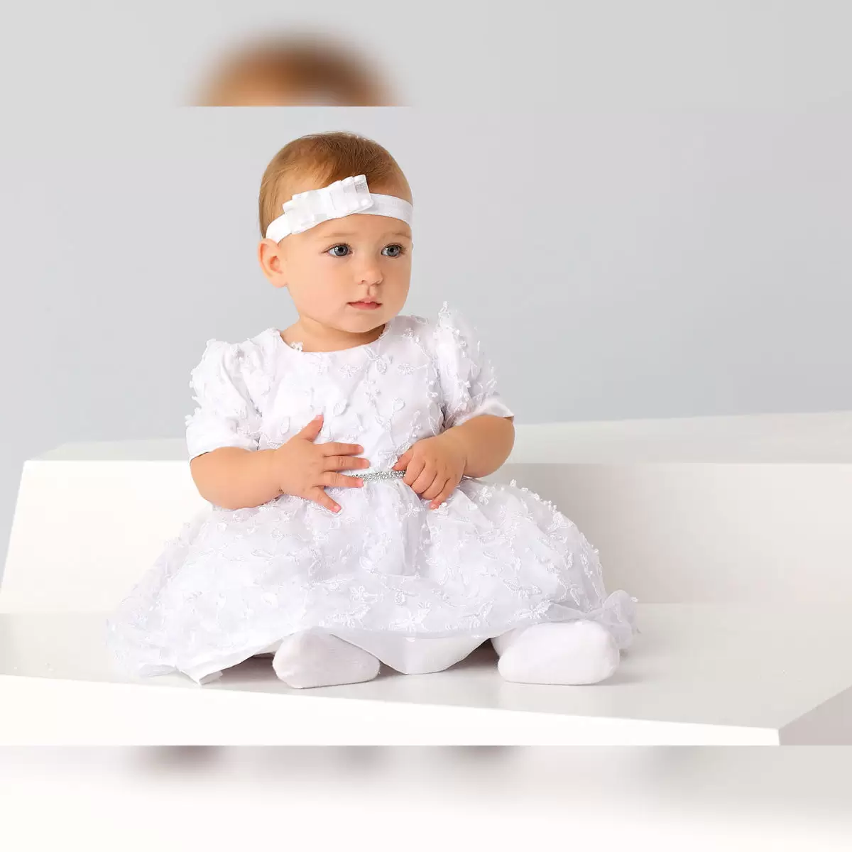 Einzigartiges Taufkleid DK-S104 von Dalary aus zarter Spitze und hochwertigem Satin in Farbe Weiß. Ein Gürtel mit Strass sowie ein passendes Stirnband aus Spitze und Satin wird mitgeliefert. Das Kleid hat kurze Ärmel und wird hinten mit einem Reißverschluss verschlossen. Zum Kleid empfehlen wir einen Bolero oder Mantel für Mädchen.