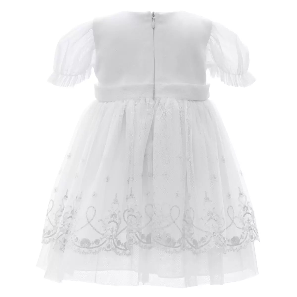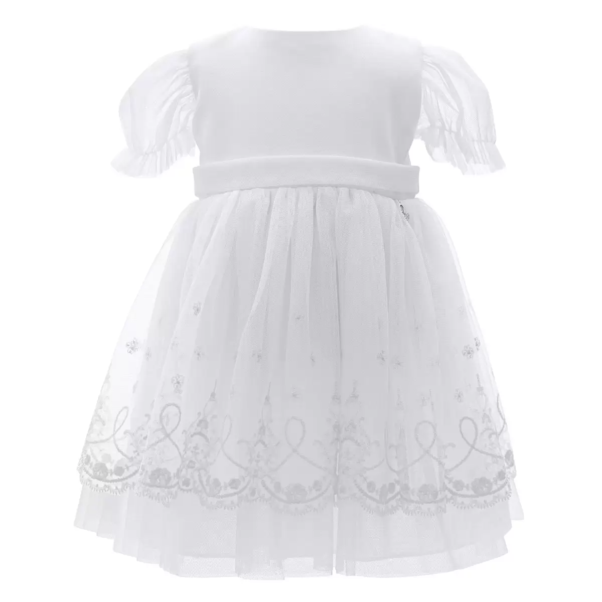 Eine ideale Wahl für das große Fest der Taufe! Taufkleid Dalary DK-S1502 aus der Premium-Kollektion. Hergestellt aus zartem Tüll in Farbe Weiß, der unten mit zarter Stickerei verziert ist. Mit kurzen Ärmeln aus Tüll, die mit einem Gummiband versehen sind. Die Länge des Kleids reicht bis über das Knie.
